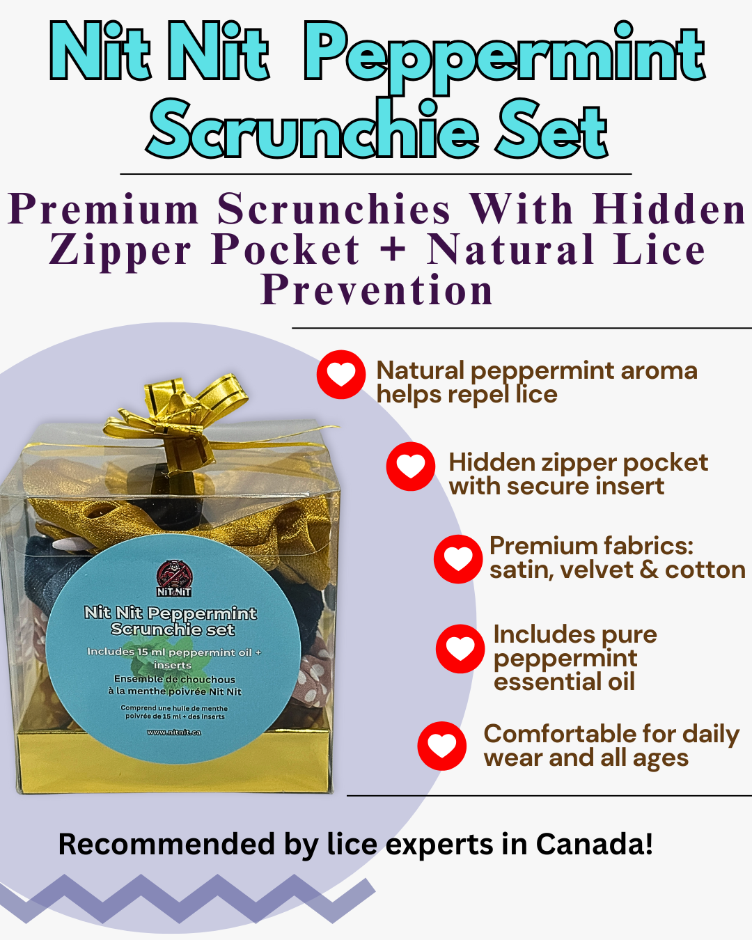 Repel lice naturally with stylish, high-quality scrunchies. Includes hidden zipper pocket + pure peppermint oil insert.