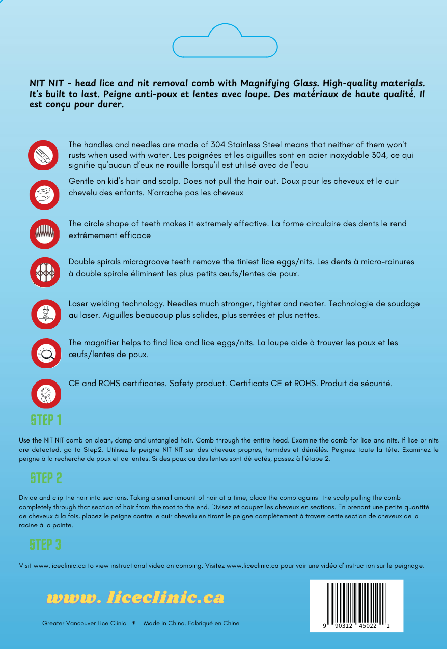 Say goodbye to lice with confidence! The Nit Nit Premium Lice Comb is a professional-grade tool designed for effective lice and nit removal at home or in a clinical setting. Developed by the experts at Greater Vancouver Lice Clinic, this comb is the same one we trust and use every day in our treatments.